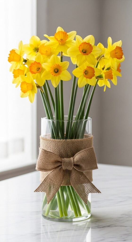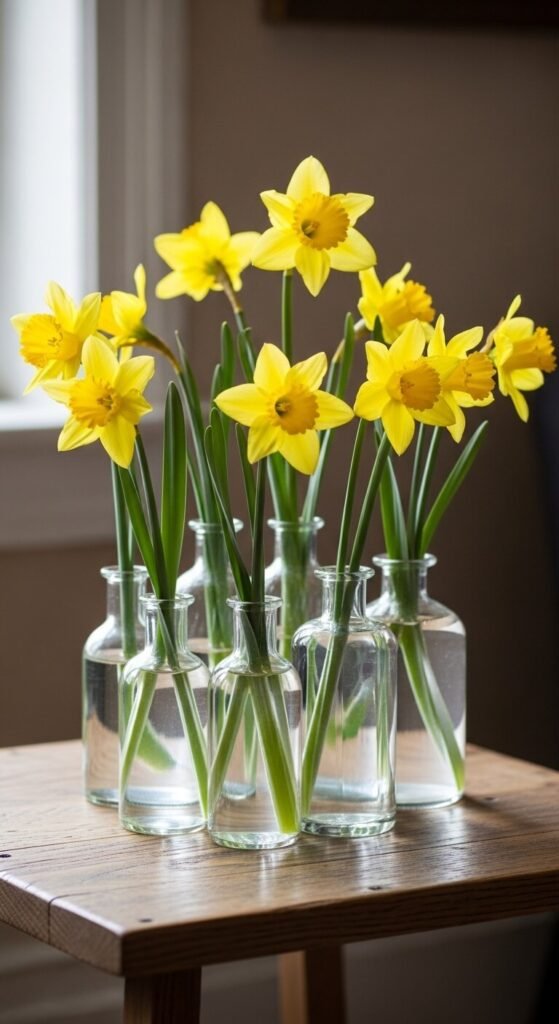 Put 1-3 daffodils in each vase. Cluster them together on a coffee table or console. The varied heights create visual interest without looking cluttered.