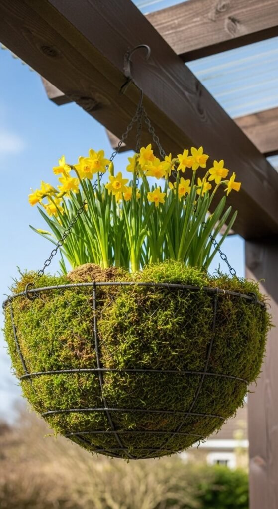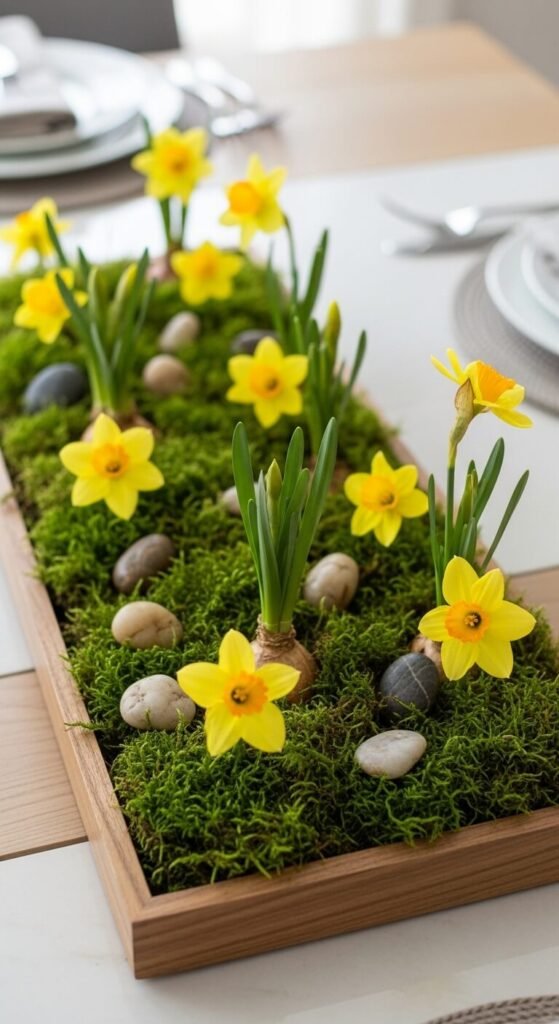 Add decorative elements like eggs, twigs, or small candles between flowers. The moss stays fresh for days if you mist it. This looks expensive but isn’t.