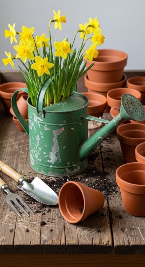 An old watering can makes a delightful daffodil container. Look for one at yard sales—usually $5 or less. Rust and dents add character.