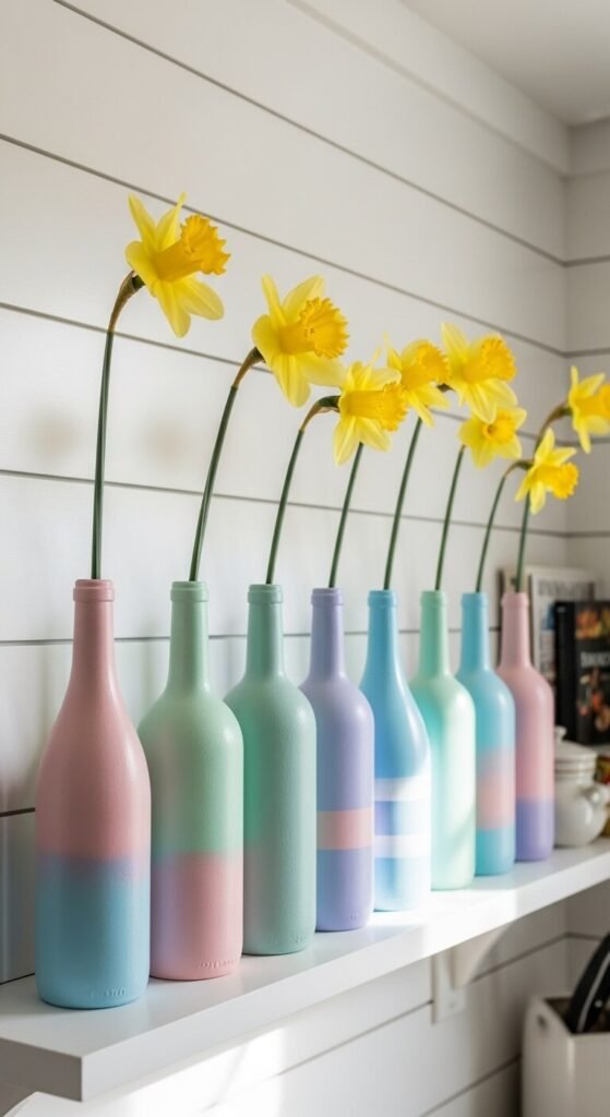 Add one daffodil per bottle. Line up 5-6 bottles on a shelf or mantel. Alternate bottle colors for rhythm.