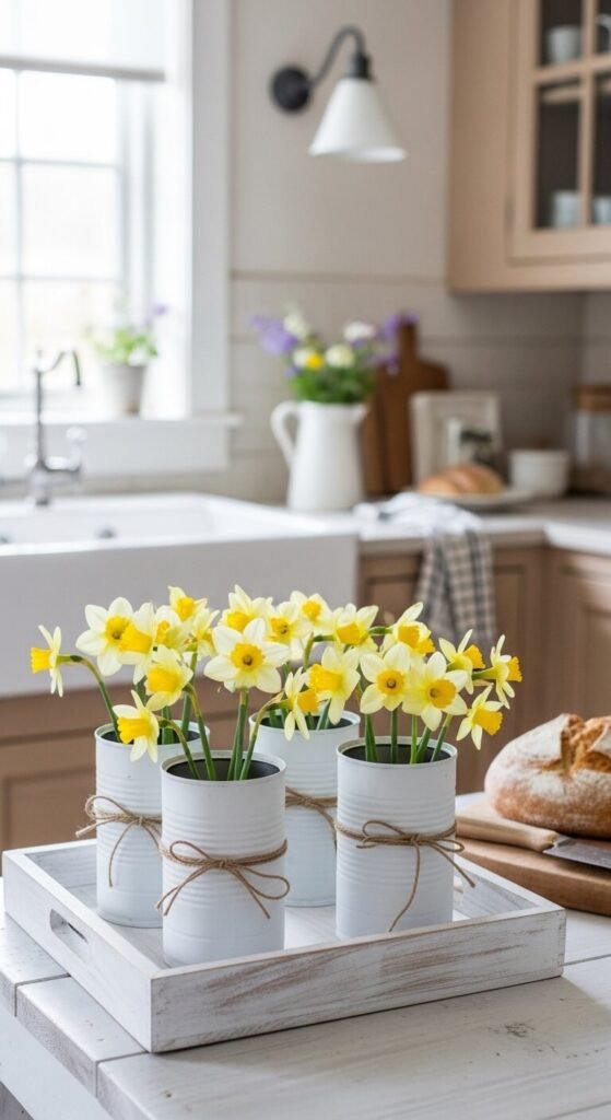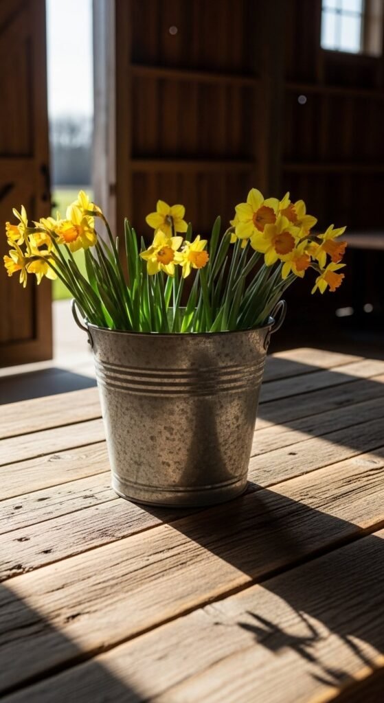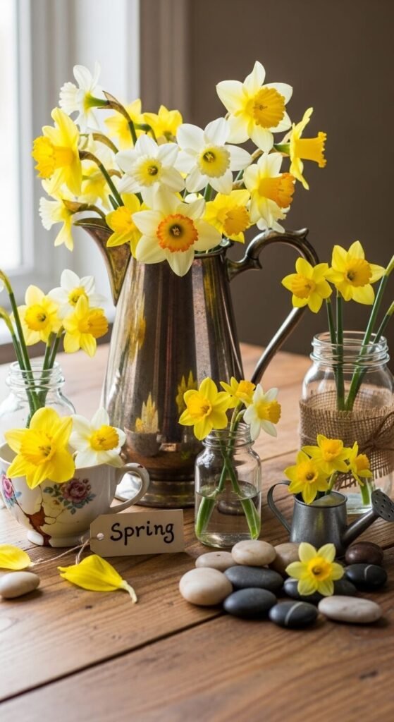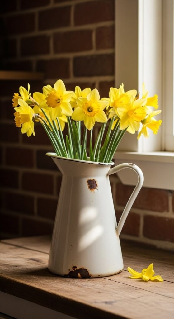 White enamel or ceramic pitchers give daffodils a farmhouse vibe. You can find these at flea markets for $5-15. The worn look adds authenticity.