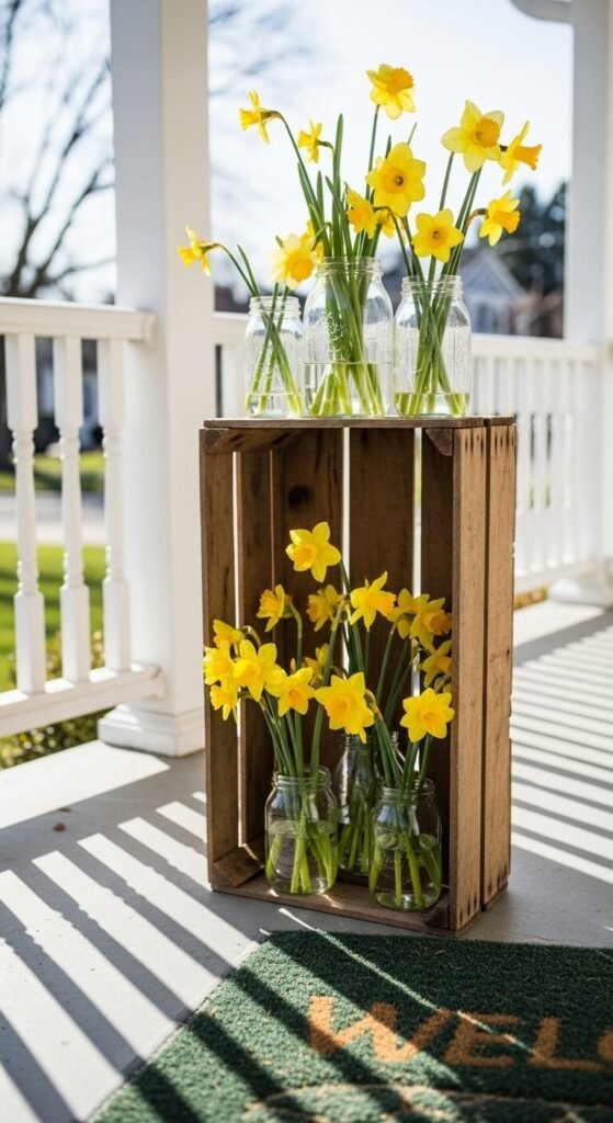 Fill each jar with water and daffodils. Use 5-7 jars depending on crate size. Mix tall and short stems for dimension.