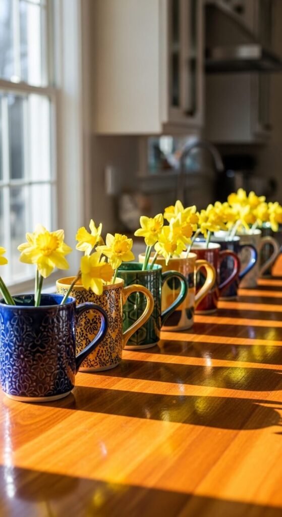 Add 3-5 daffodils per mug. Mix flower heights so some blooms peek higher than others. The wide mug opening makes arranging easy.