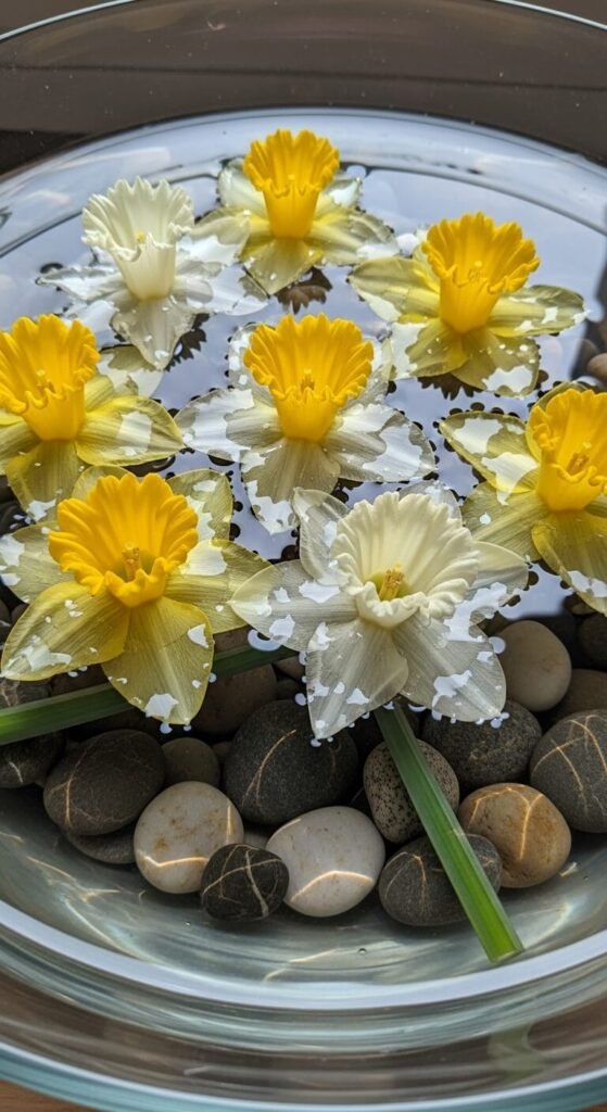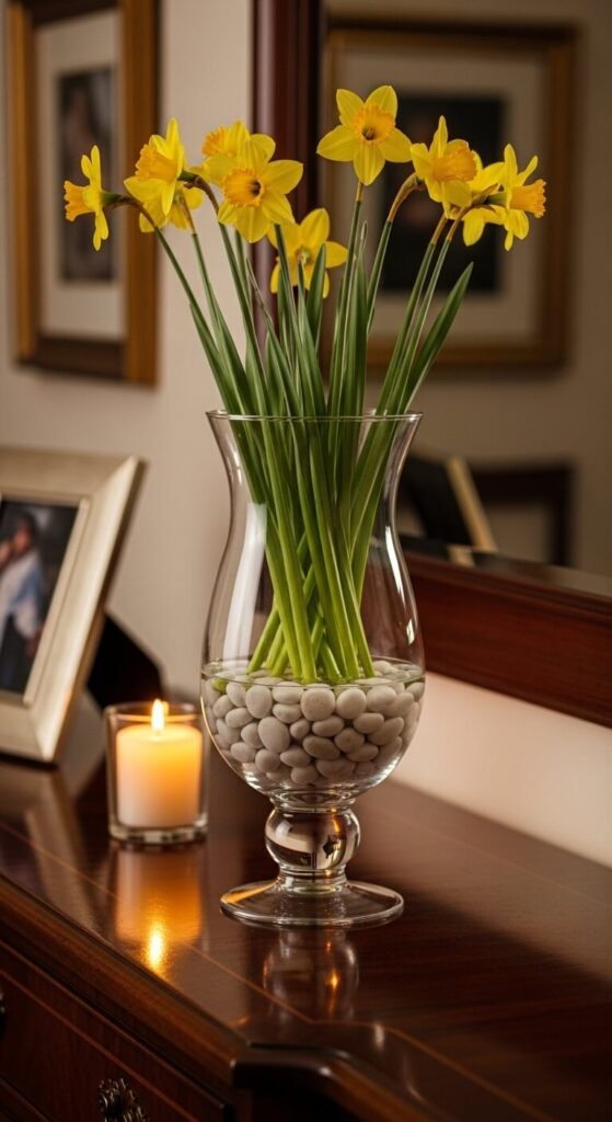 Fill with water. Add 10-15 daffodils. The stones hold stems in place and hide them partially. This creates a clean, modern look.