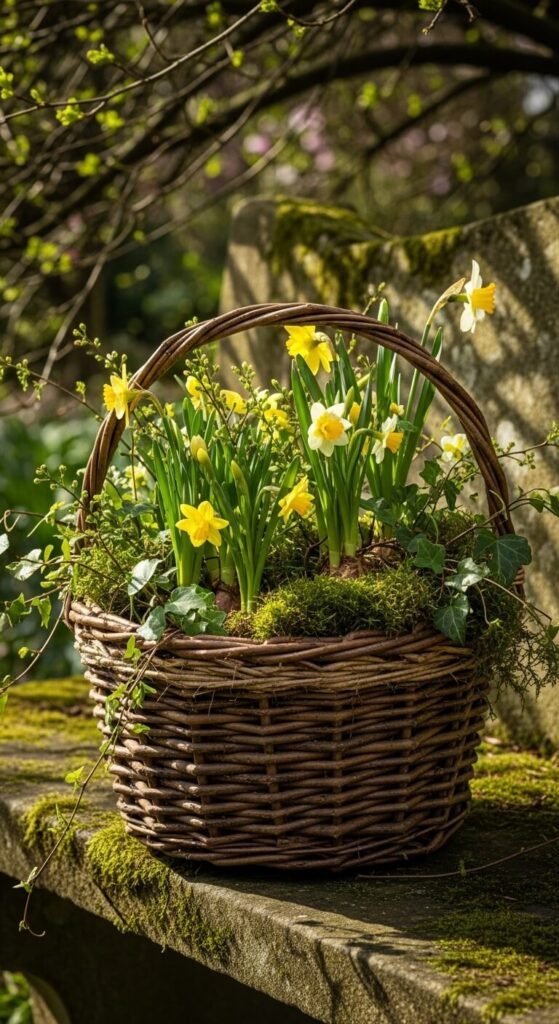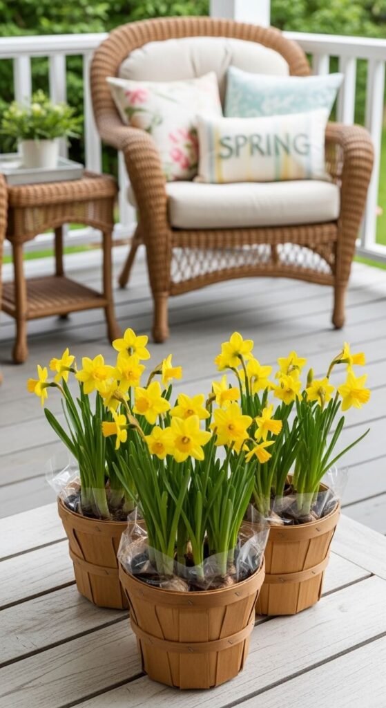 Fill with water and add 5-7 daffodils per basket. The small scale feels intimate. Group three baskets together for impact.