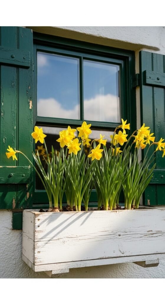 Window boxes aren’t just for outdoor planting. Place cut daffodils in a window box with water-filled jars hidden inside. Arrange stems to cascade over the edges naturally.
