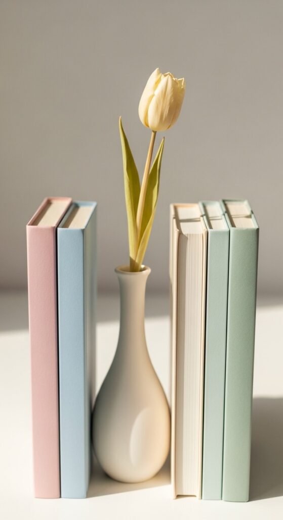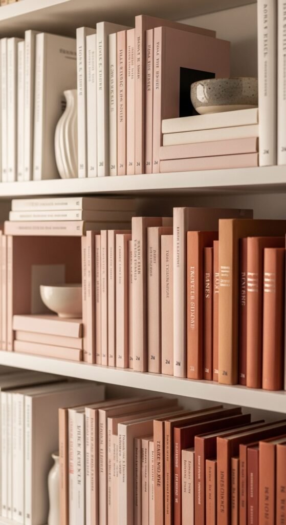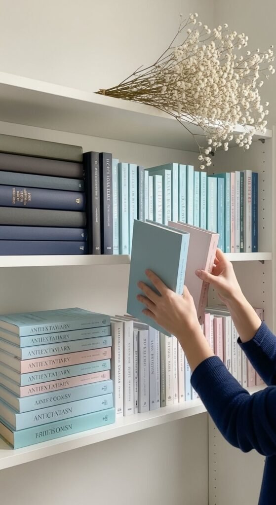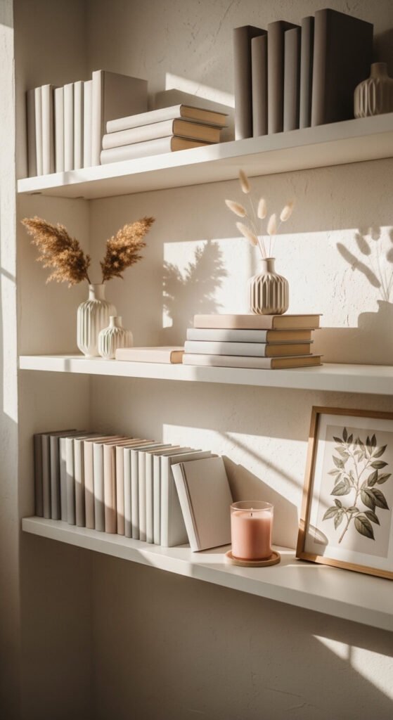 Pick two or three colors you love and let them guide everything on the shelf. It could be soft white, sage green, and warm tan — or blush, ivory, and dusty blue. Group books by spine color to create a subtle rainbow effect. Add a small vase or candle in a matching shade. This one trick makes a shelf look intentional without spending a cent. You can even turn books spine-inward for a cleaner, more neutral look.