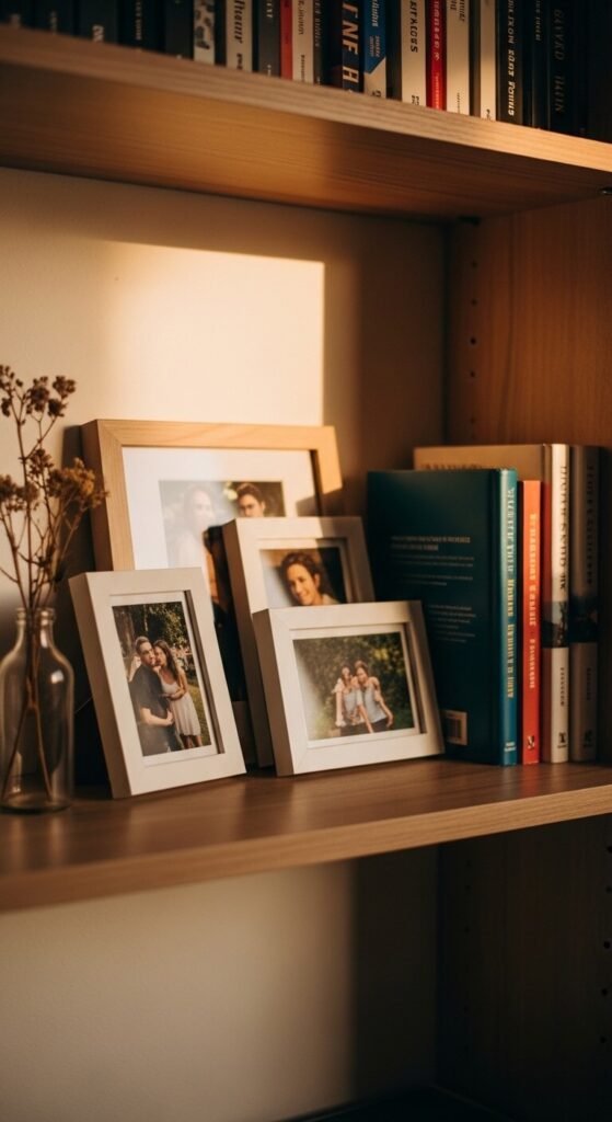 Use one shelf section as a tiny gallery wall. Lean three or four small frames together — photos, postcards, or prints. Vary the sizes so they overlap slightly. You don’t need matching frames; mismatched ones look more personal. Print your favorite photos at a drugstore for under $1 each and slip them into frames from a thrift store. This is the cheapest way to add emotion and memory to a shelf.