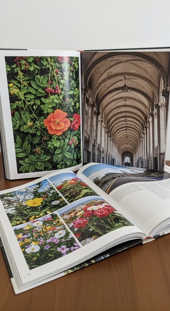 [Image Prompt: A bookshelf photograph with a large hardcover coffee table book propped open to a full-bleed floral illustration, leaning against the back of the shelf like a piece of art. Surrounding books stand upright in soft, neutral-toned spines. Shot with soft diffused light on a full-frame camera, warm and editorial, shallow depth of field, no text visible in the image.]