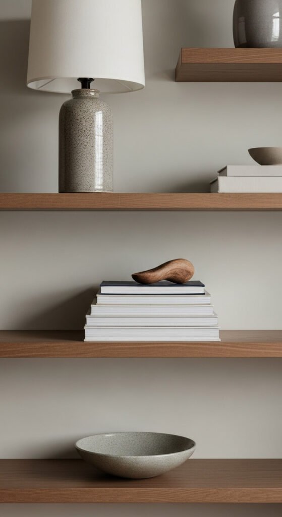Shelves look flat when everything sits at the same height. Mix tall, medium, and short items across each shelf. A tall candlestick next to a short stack next to a medium vase creates a skyline effect. Your eye naturally travels across the shelf instead of glazing over it. This costs nothing if you already have objects around your home — just rearrange what you have with height in mind.