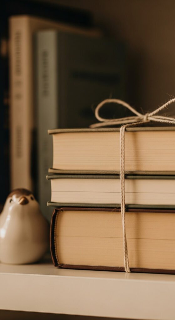 Tie a small stack of books with a piece of linen twine or a thin velvet ribbon. It sounds simple — and it is — but it looks incredibly charming. Use a neutral ribbon so it doesn’t compete with surrounding colors. This works especially well on a guest room shelf or a styled corner you photograph often. You can find linen twine at craft stores for about $3 a spool. One spool styles five or six stacks easily.