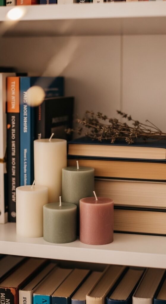 Candles are one of the easiest ways to add warmth, height variation, and scent to a shelf. Group three small candles together in complementary colors. You don’t even need to burn them — they look great unlit. Check TJ Maxx, HomeGoods, or Target dollar bins for affordable options. Mix heights using a pillar, a votive, and a small taper. The waxy texture contrasts beautifully with smooth books and ceramics.