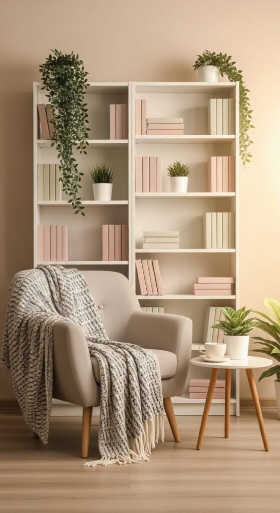 Style your shelf as part of a whole reading corner. Bring the vibe outward — a throw blanket, a side table, a small plant on the floor nearby. The shelf becomes the backdrop of a little world. This is especially impactful if your shelf sits near a chair or window. You don’t need to buy anything new; just pull a blanket, a stool, and a candle from elsewhere in your home and group them intentionally.