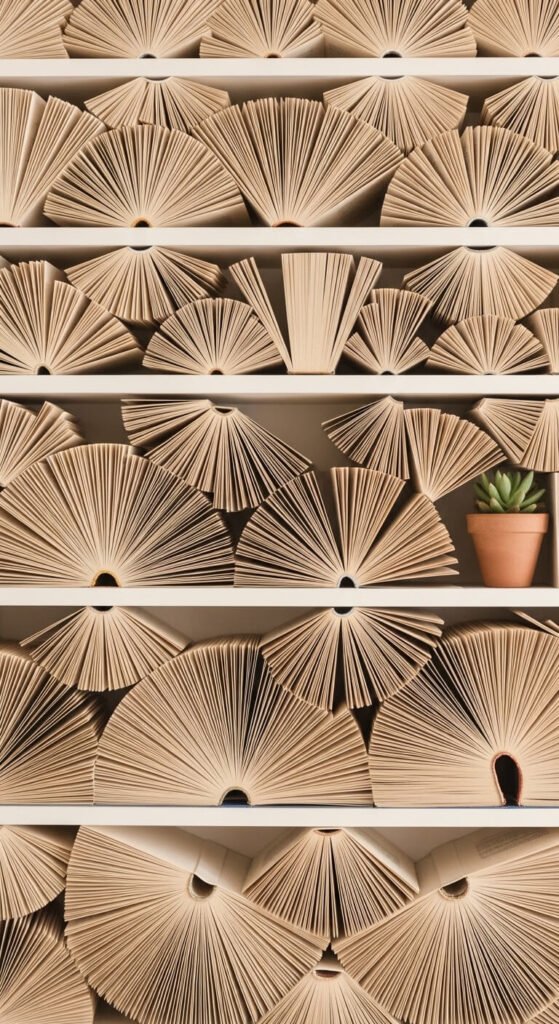 Pick one color and go all in. A white-on-white shelf with cream books, ivory candles, and a bleached wood object feels spa-like and calming. A sage green shelf with all green and forest-toned books feels earthy and grounded. Buy a few cheap paperbacks at a used bookstore to fill color gaps. You’re not decorating with books you hate — you’re using them as color blocks. It’s surprisingly satisfying.