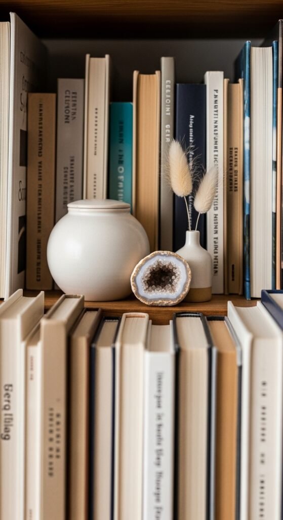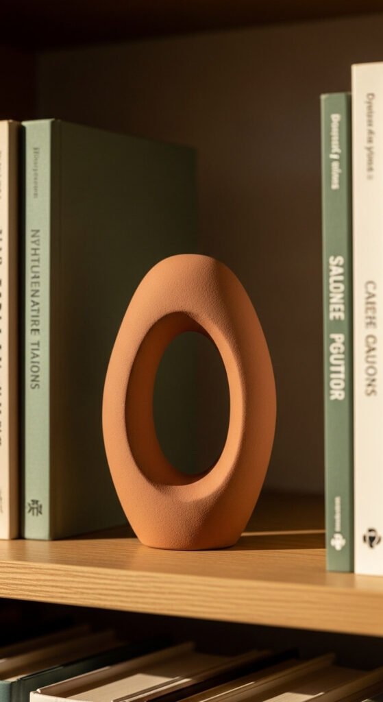 A small sculptural object gives a shelf genuine character. It doesn’t need to be expensive. A smooth river stone, a wooden sphere, a ceramic hand, or a pinecone painted white all count. Look for interesting shapes at thrift stores or even on a walk outside. The key is choosing something with an interesting silhouette that contrasts the rectangular shapes of books. One unique object per shelf section is plenty.