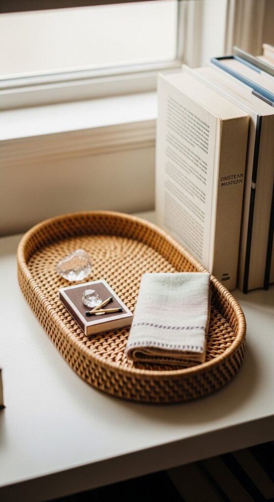 A small tray corrals small objects so they look intentional instead of scattered. Any flat tray works — wood, rattan, ceramic, or even a saucer. Place it on a shelf and fill it with three tiny things: a crystal, a matchbook, a small folded cloth. The tray acts as a visual frame that tells the eye these objects belong together. Dollar stores and thrift shops almost always have small decorative trays under $5.