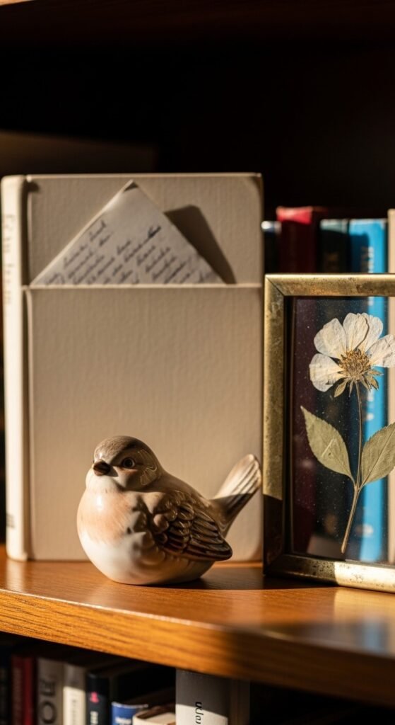 The most personality comes from things that actually mean something to you. A tiny souvenir from a trip. A vintage find from your grandmother. A small figurine you’ve had since childhood. These don’t cost anything and they make your shelf genuinely yours. No one else will have the same shelf. Styling around a meaningful object first, then filling in with books and plants, produces a result that feels real instead of generic.