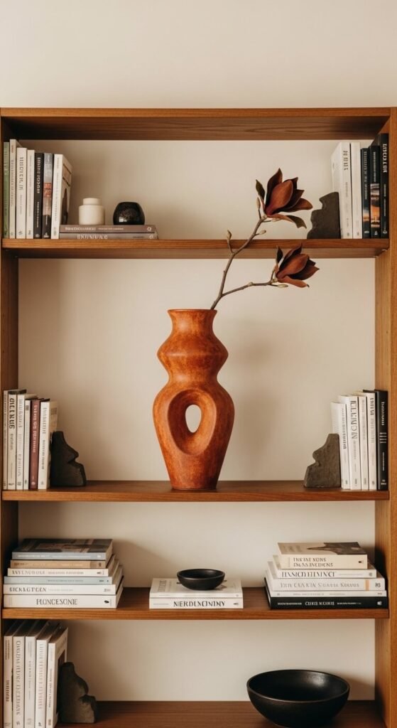 Every great shelf has one anchor object — a piece the eye goes to first. Put it at eye level and center it loosely. A taller vase, a meaningful sculpture, a standout book with a beautiful cover facing outward. Everything else on the shelf should support that one hero piece without competing. You don’t need to spend much — a single striking thrift store vase can do this job. When in doubt, simplify everything around it.