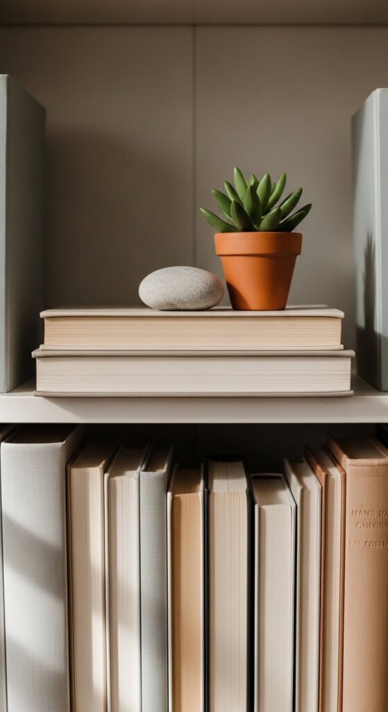 Not every book needs to stand up. Lay a few horizontally in small stacks of two or three. This breaks the visual rhythm and creates a natural resting spot for small objects on top. A smooth stone, a tiny plant, or a folded linen card all work beautifully. Use stacks to fill in gaps where books don’t quite reach the shelf above. It’s a simple trick that makes the whole thing look more curated.