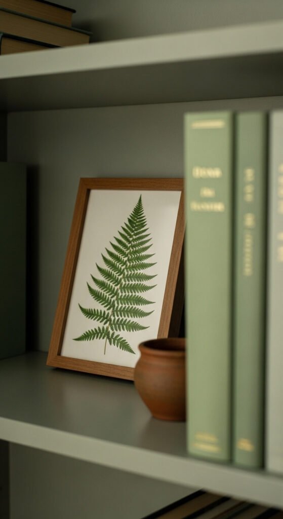A small framed print leaning against the shelf back instantly adds personality. You don’t need to hang it — just lean it casually against the wall behind your books. Botanical prints work especially well in spring: ferns, wildflowers, pressed leaves. Print one for free from a public domain site like Rawpixel and pop it in a $2 thrift store frame. Swap it out whenever you want a change. It’s the easiest art trick around.