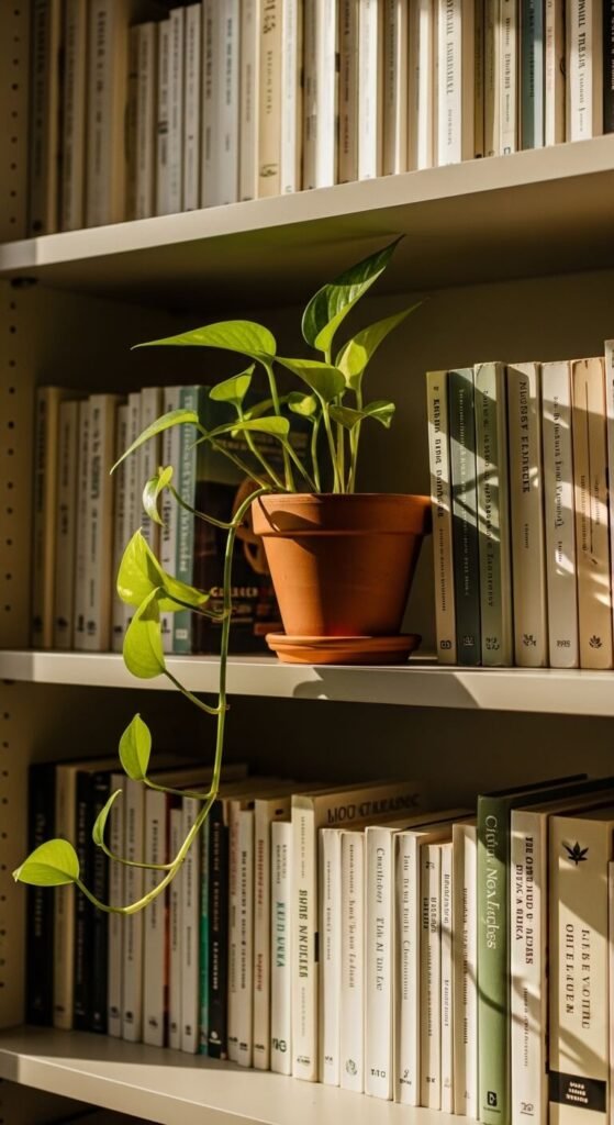 A trailing plant like pothos, string of pearls, or ivy adds movement to an otherwise static shelf. Place it near the edge of a shelf so the vines drape down naturally. Pothos is nearly impossible to kill and costs about $5 at most garden centers. The green against book spines creates an easy contrast. If you travel often, opt for a realistic faux trailing plant — the good ones look surprisingly convincing.