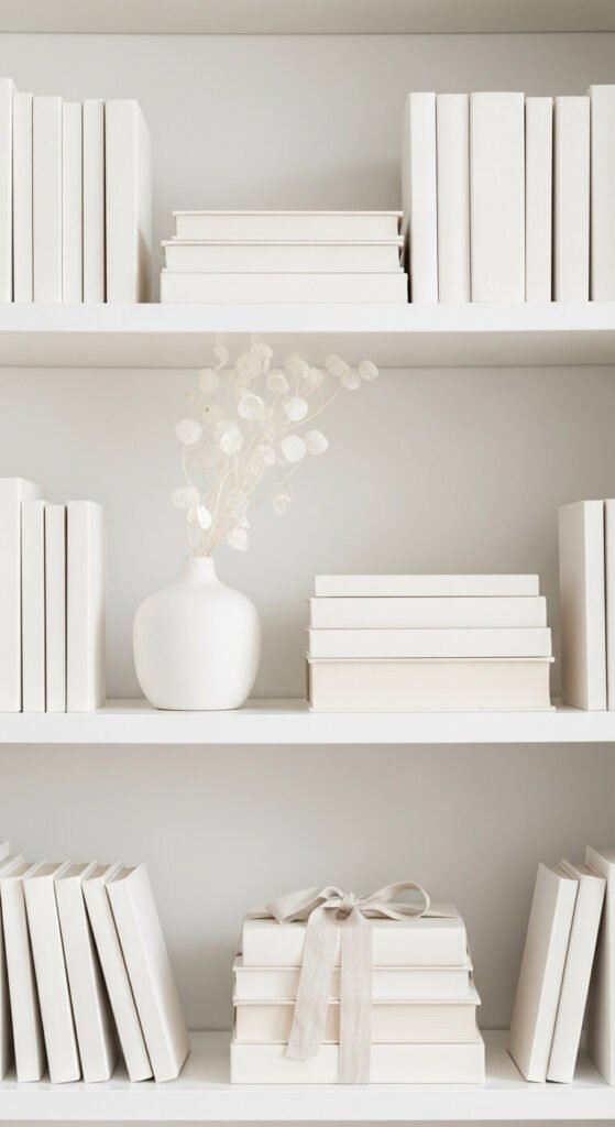 Turn a row of books so the pages face out instead of the spines. This creates a beautiful, soft, paper-textured effect in creamy white. It hides any ugly or mismatched spines instantly. It works best for a single shelf to create contrast with shelves where spines face forward. This is completely free and takes two minutes. Add one small object at the end of the row to anchor the arrangement.
