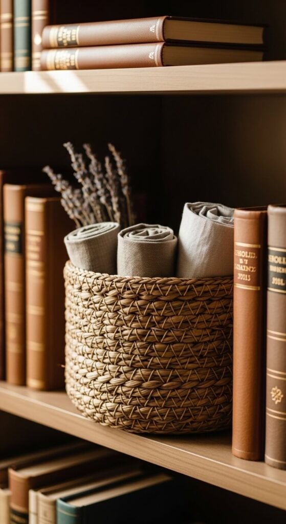 Woven baskets add warmth and texture that books alone can’t provide. A small seagrass or rattan basket hides clutter while looking beautiful. Use one to store charging cables, small notepads, or candle lighters. Dollar Tree and thrift stores often carry cute woven pieces. Tuck it on a lower shelf where it anchors the whole arrangement. Mixing hard-edged books with soft woven textures creates a balance that feels lived-in and real.