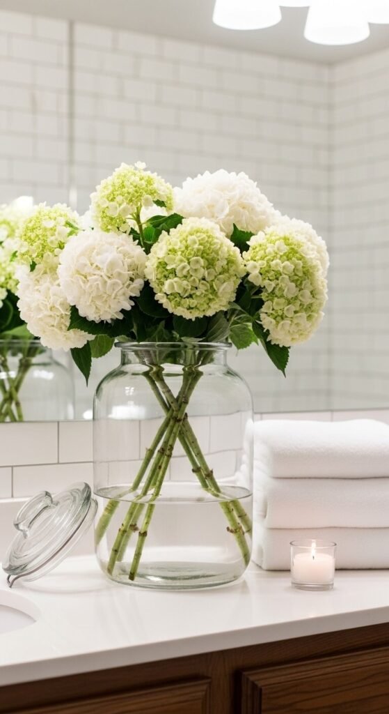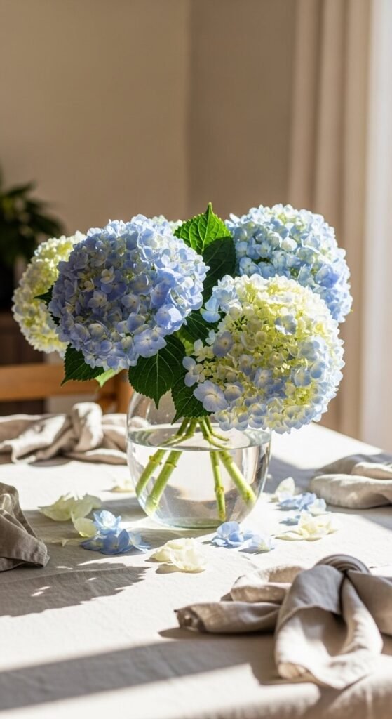 This is one of the easiest and most overlooked hydrangea displays. Snip individual bloom heads — leaving almost no stem — and let them float in a shallow bowl of water. A white ceramic bowl or a low glass dish works perfectly. Add a few floating candles alongside the blooms for an evening tablescape. This works for dinner parties, spa-style bathroom displays, or coffee table styling. The whole setup takes about five minutes and costs almost nothing if you’re using blooms from your garden.