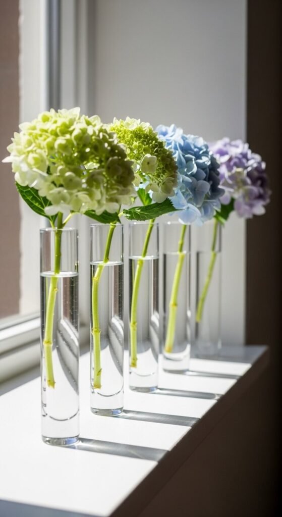 Single stems in bud vases are an underrated decorating move. Line up four to six narrow vases along a windowsill, shelf, or mantel. Place one hydrangea stem in each — and let the colors shift gradually from cool green to blue to purple for an ombre effect. This uses very few flowers and looks striking. Bud vases are inexpensive at dollar stores or thrift shops. The row format creates a gallery-like display that feels intentional and modern without requiring any arranging skill.