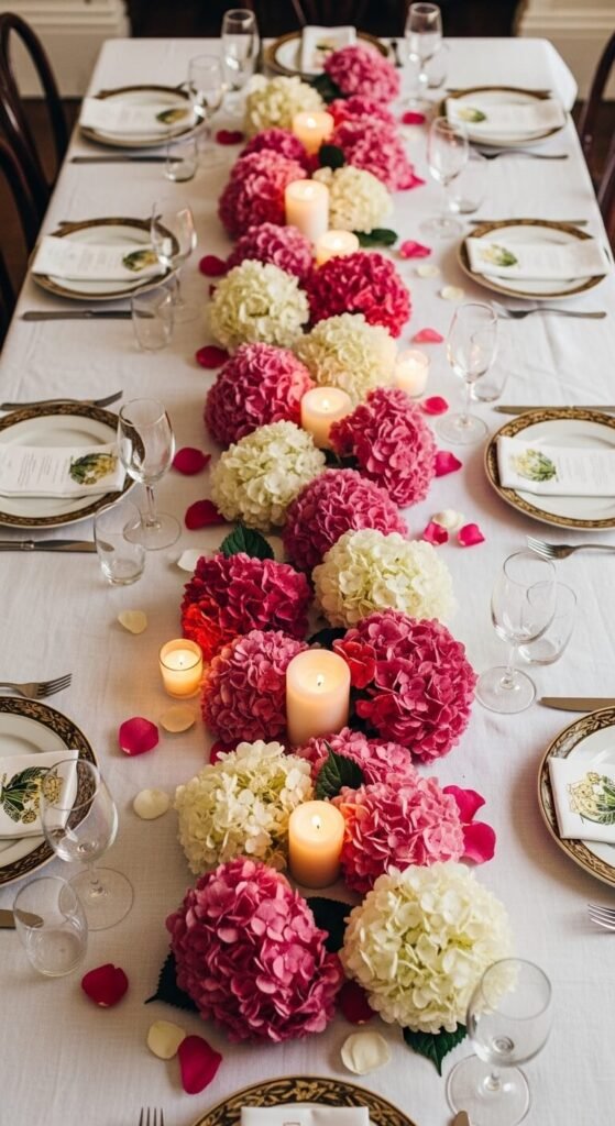 A hydrangea table runner made of loose blooms is stunning for dinners, holidays, or celebrations. Lay individual bloom heads directly on the tablecloth in a long, loose row down the center. Tuck in small candles, greenery, or rose petals between the blooms. This works best with hearty hydrangea heads that won’t wilt quickly — or use faux blooms for a reusable setup. The whole look takes 15 to 20 minutes to arrange and makes a significant visual impact at almost no cost compared to a traditional floral centerpiece.