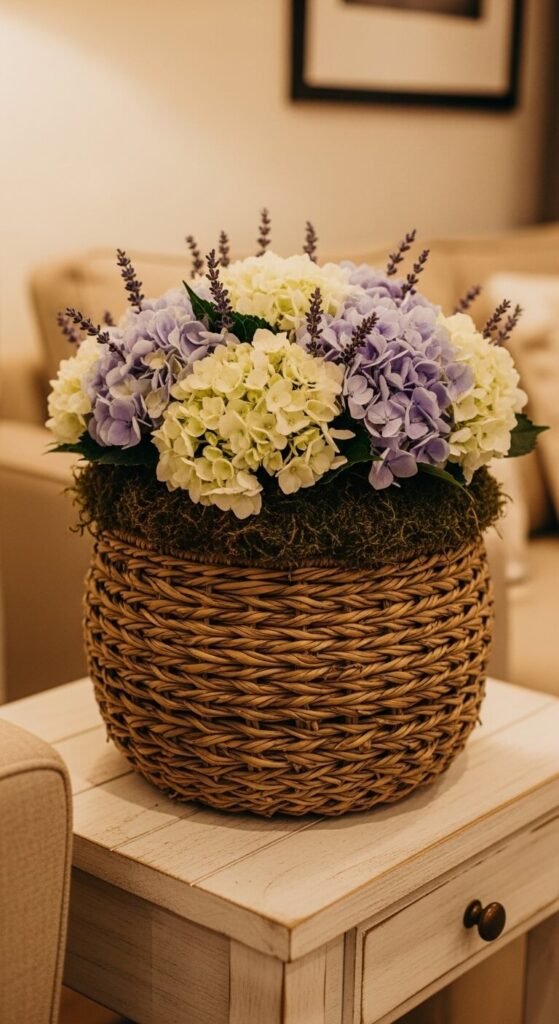 Baskets and hydrangeas are a natural pairing. Line a woven basket with a plastic liner or a jar of water and fill it with hydrangea stems for a garden-fresh look. Tuck in a little sheet moss around the base of the stems to hide the mechanics. Baskets add warmth and texture that a traditional vase doesn’t. This look suits living rooms, entryways, and porches perfectly. Thrift store baskets work great here — you don’t need to spend much. The organic, earthy feel of woven materials makes the soft blooms stand out even more.