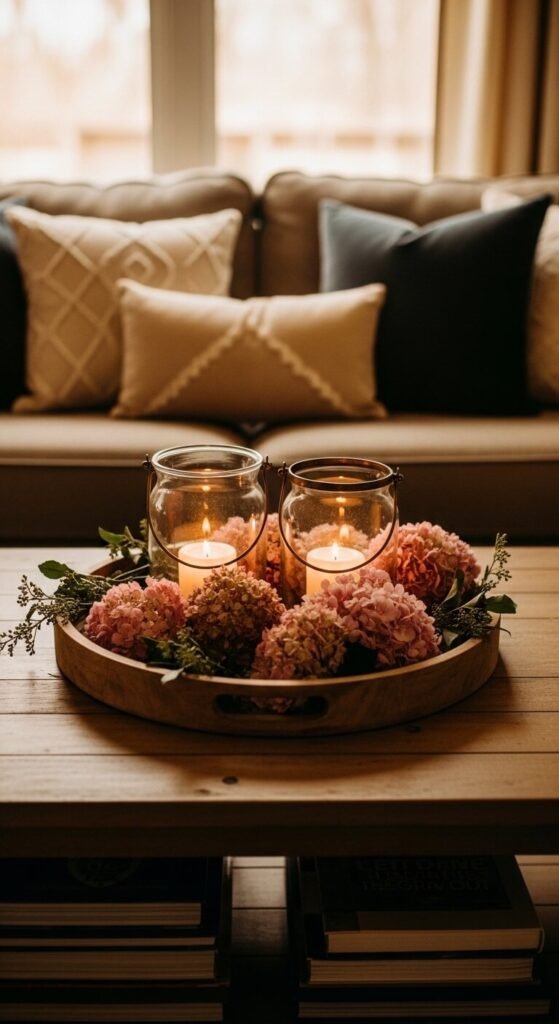 Hydrangeas and candlelight go together effortlessly. Group two or three glass lanterns on a tray and nestle hydrangea bloom heads around them in a loose, organic cluster. This works as a coffee table centerpiece, a sideboard display, or an outdoor porch setup. Faux hydrangeas work especially well here since candle heat can accelerate wilting of fresh blooms. Changing out the hydrangea colors seasonally — soft pastels in spring, warm blush in fall — keeps the display looking current without replacing the lanterns.