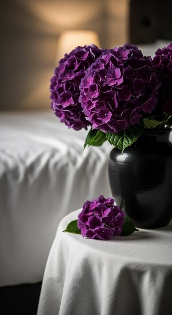 A single-color arrangement in deep purple or violet makes a bold, confident statement. Choose one shade and commit to it fully — same colored blooms, all grouped tightly in a dark or neutral vase. The depth of purple hydrangeas is especially striking in bedrooms or sitting rooms. This monochromatic approach feels more intentional than a mixed bouquet. It also photographs beautifully if you enjoy styling your home for social media. Deep purple pairs well with charcoal, navy, and warm wood tones for a rich, layered interior look.