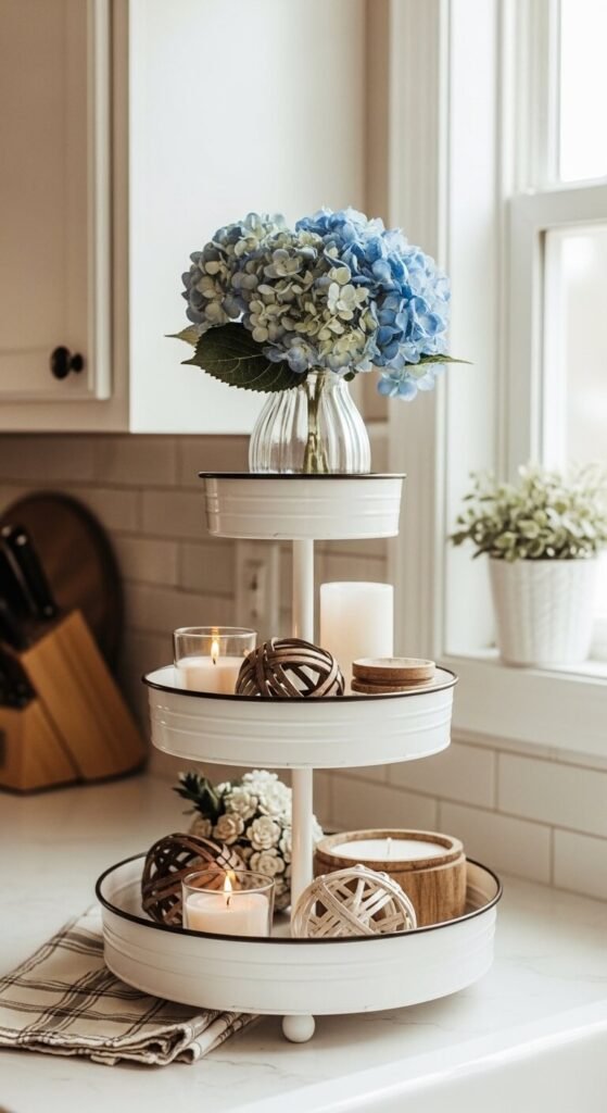 Tiered trays are a popular styling prop — and hydrangeas fit right in. Add a small bud vase with one or two hydrangea stems on the top tier for a pop of color and softness. The floral element keeps a tiered tray from looking too staged or commercial. Balance it with small candles, a little greenery, and a seasonal accent on the other tiers. This is a great low-effort way to bring florals into the kitchen without committing to a large arrangement. Swap blooms seasonally to keep the tray looking current.