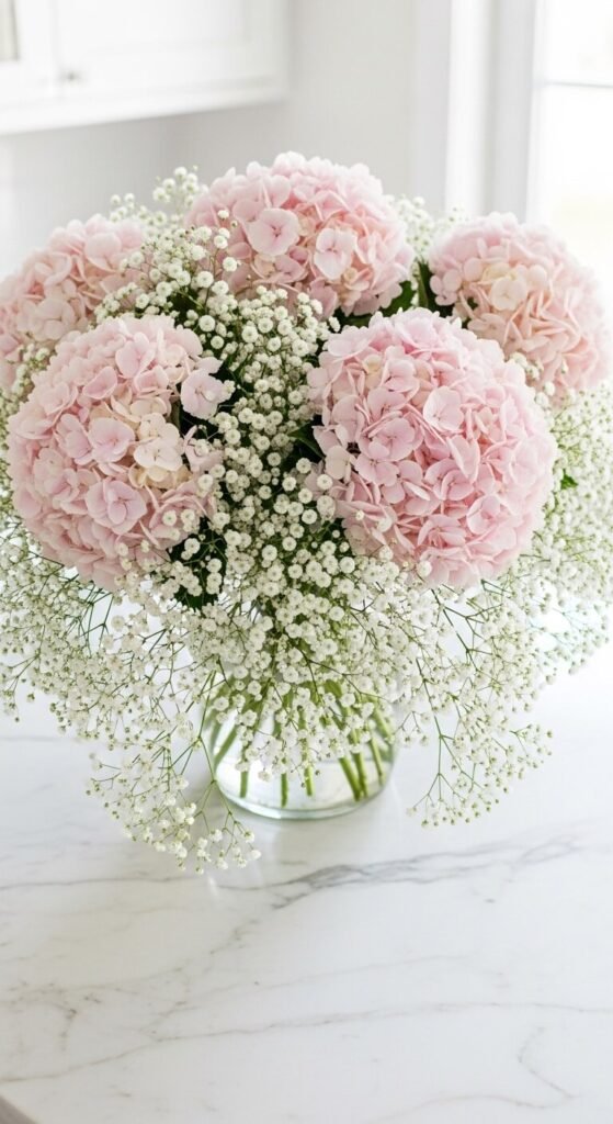 Baby’s breath and hydrangeas are a classic combination that feels both romantic and down-to-earth. Baby’s breath is one of the most affordable flowers available — often just $2 to $3 per bunch — and its fine texture makes hydrangea blooms look even fuller and more lush. Arrange hydrangeas first, then weave baby’s breath throughout the arrangement to fill gaps. This mix works in any room and for any occasion. It’s a great way to stretch a small number of hydrangea stems into a larger, fuller-looking arrangement.