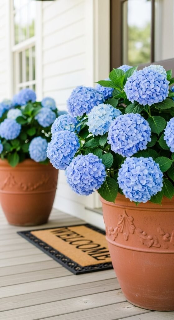 18. Outdoor Hydrangea Pot Display on a Porch