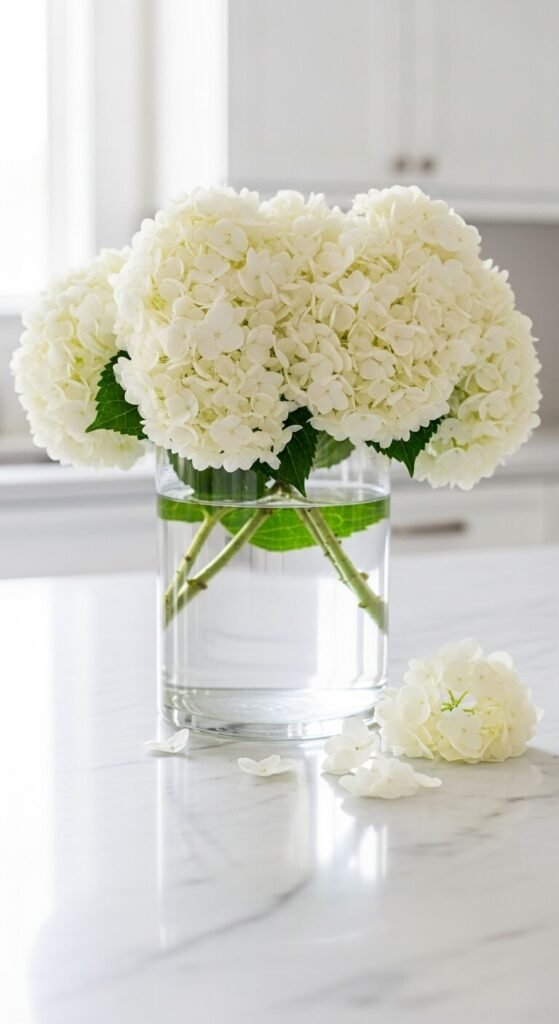 1. Classic White Hydrangeas in a Clear Glass Vase