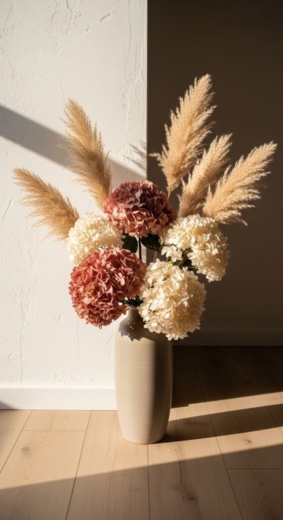 Pampas grass and dried hydrangeas are a match made for modern boho interiors. The fluffy texture of pampas grass makes dried hydrangea blooms look even more dimensional and interesting. Arrange both in a tall, wide-mouthed vase — no water needed since both are dried. This type of arrangement is fully maintenance-free and lasts for a year or more. It works beautifully in living rooms and bedrooms. Look for dried pampas at craft stores or online shops. The combined cost of both materials is usually under $20 for a full arrangement.