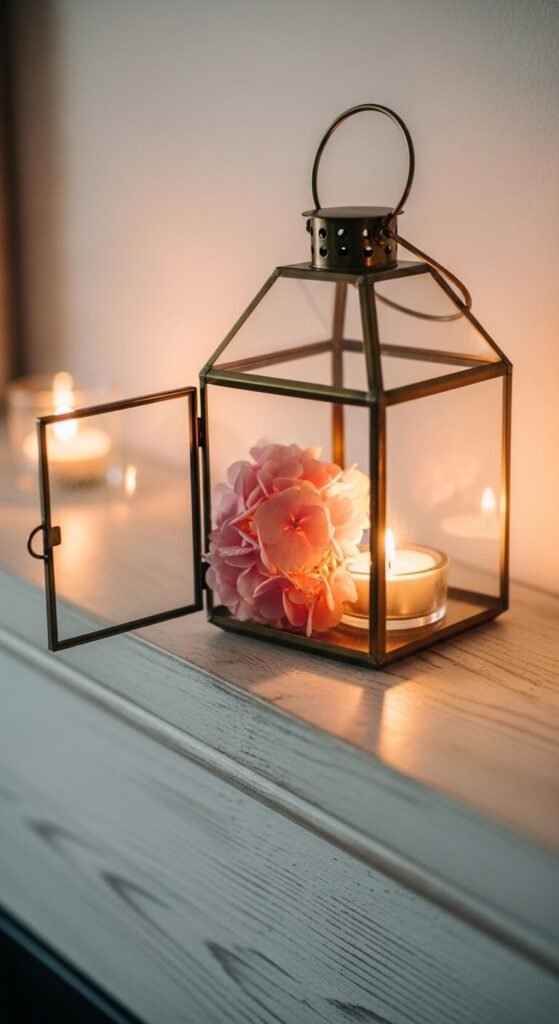 Placing a single hydrangea bloom inside a lantern is a small detail that makes a big difference. No vase or water required — just snip a bloom and set it inside the lantern beside a tea light. The glow of the candle through the petals creates a warm, atmospheric effect. Swap fresh blooms every few days. This works beautifully on a mantel, entry console, or dining table. It’s one of the easiest and least expensive decorating ideas on this list, and it photographs strikingly for home inspiration content.