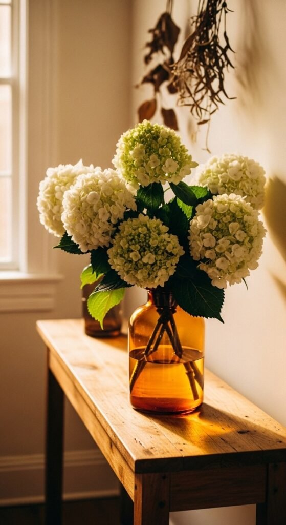 The color of your vase changes the entire feel of a hydrangea arrangement. Amber, cobalt blue, or sage green glass vases add an extra layer of color and warmth that clear glass doesn’t provide. White or cream hydrangeas look especially striking in a colored vessel — the contrast is what makes the arrangement feel styled and intentional. Thrift stores and antique markets are excellent sources for vintage colored glass vases at very low prices. Experiment with pairing vase color to the room’s existing palette for a cohesive, pulled-together look.