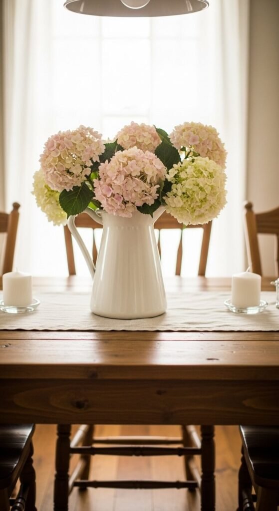 3. Hydrangea Centerpiece in a Vintage Pitcher