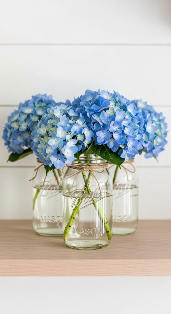 Mason jars are the most budget-friendly flower vessels you’ll find. Group three jars of different heights together for a layered look that feels intentional. Add two to three blue hydrangea stems per jar — more than that gets crowded. Tie a strip of twine or raffia around each jar for a simple finishing touch. This cluster arrangement works on open shelving, a windowsill, or a bathroom counter. The varying heights create visual interest without any floral arranging skills needed.