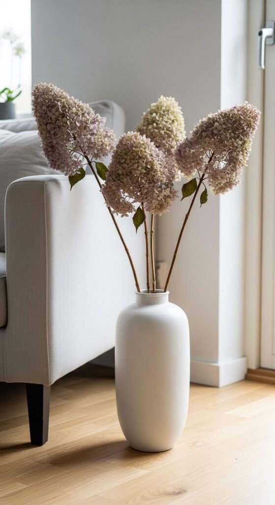 Tall dried hydrangea stems in a floor vase make a dramatic statement with almost zero effort. Look for large ceramic floor vases at home goods stores or secondhand shops. Dried hydrangea stems hold their shape well and don’t need water, so this is a true set-it-and-forget-it display. The muted tones of dried blooms — dusty violet, antique pink, cream — work with almost any color scheme. This is a great choice for living room corners that feel bare or for entryways that need a soft, natural touch.