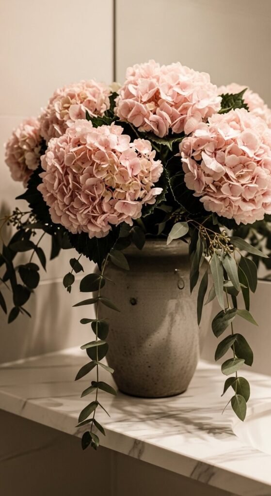 Pairing hydrangeas with eucalyptus is one of the most popular florist tricks — and you can recreate it easily at home. Eucalyptus adds texture and a soft herbal scent that complements hydrangea beautifully. Grab a bunch of eucalyptus from a grocery store floral section (usually $3 to $5) and layer it around your hydrangea stems in a vase. The green-gray leaves make pink or white blooms pop. This combination works especially well in bathrooms and bedrooms where the subtle eucalyptus fragrance adds to the atmosphere.