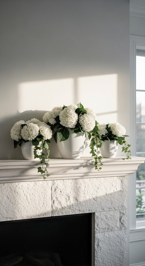 An all-white mantel arrangement feels polished and sophisticated without trying too hard. Use three matching white pots or vessels — varying the height slightly — and fill each with white hydrangea stems. The uniformity of the vessels keeps the look clean while the fullness of the blooms adds warmth. Add a few green leaves for contrast. This works for year-round decorating and pairs well with both modern and traditional interiors. If fresh flowers aren’t practical, high-quality white silk hydrangeas work just as well here.