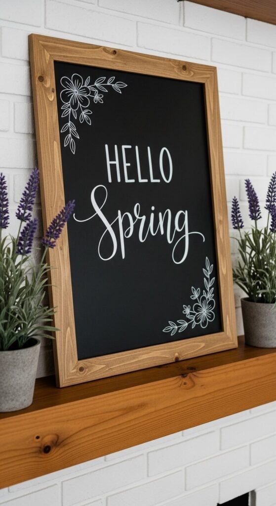 “Hello Spring” or “Bloom Where You’re Planted” work perfectly. Add small flower doodles in the corners. Prop it against the wall with plants on each side.