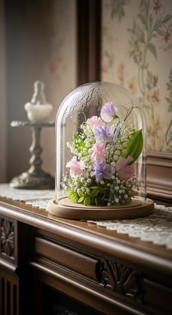 A glass cloche adds instant elegance. Place a small floral arrangement or potted plant underneath on a wooden base.