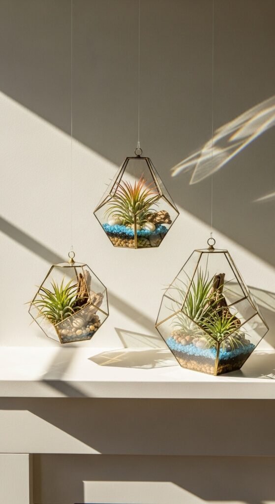 This modern approach costs $30 for three terrariums. The floating effect is unexpected and architectural. Air plants last years with basic care. Hanging them frees up your mantel surface completely for other seasonal touches.