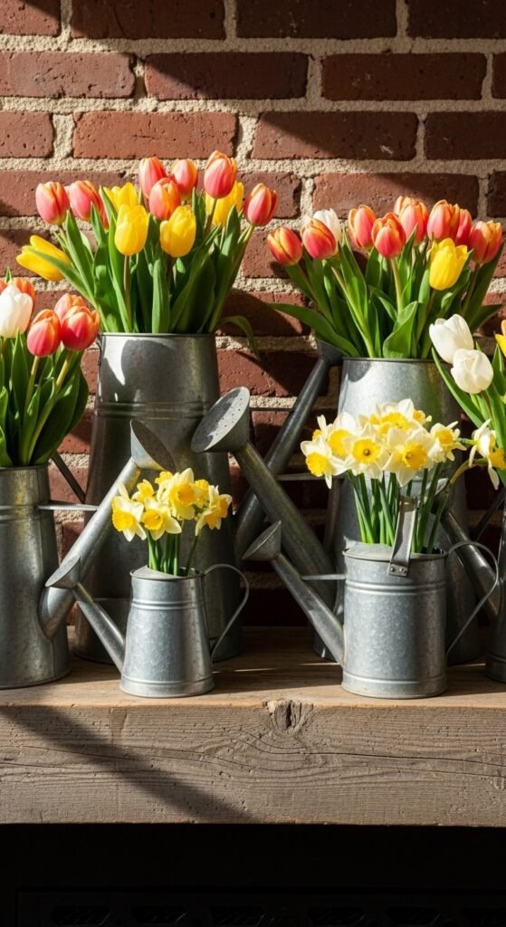 Scour thrift stores for old watering cans in different sizes and finishes. Galvanized metal adds farmhouse charm, while copper brings warmth.
