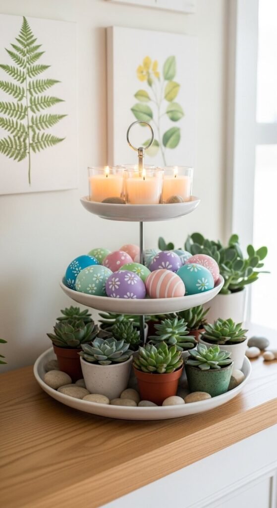 Add decorative eggs on the middle level. Top it off with tea lights in glass holders. The height variation draws the eye upward.